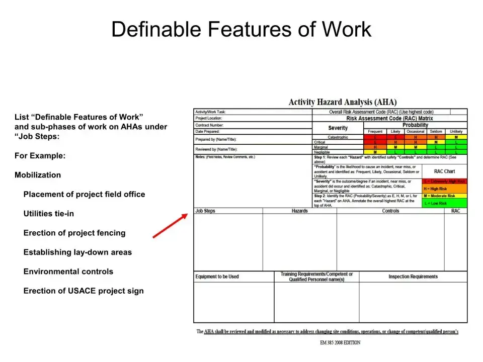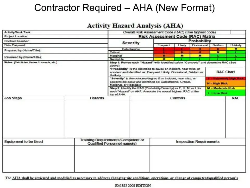 The Activity Hazard Analysis (AHA) form, specifically the EM 385 version, serves as a crucial tool for identifying and managing risks associated with various work tasks. This form outlines the specific activities to be performed, anticipated hazards, and the necessary control measures to mitigate these risks. It includes an Overall Risk Assessment Code (RAC) that categorizes risks based on their probability and severity, allowing for a structured approach to safety. Each identified hazard is assessed, and appropriate safety controls are established to reduce the risk to an acceptable level. The AHA is not a static document; it is designed to be a living record that must be reviewed and updated as site conditions change or when personnel changes occur. Additionally, the AHA must be accepted by the Government Designated Authority before work can commence, ensuring that all parties involved, including contractors and subcontractors, are aware of the risks and control measures in place. This proactive approach aims to prevent unplanned events and enhance safety on job sites.