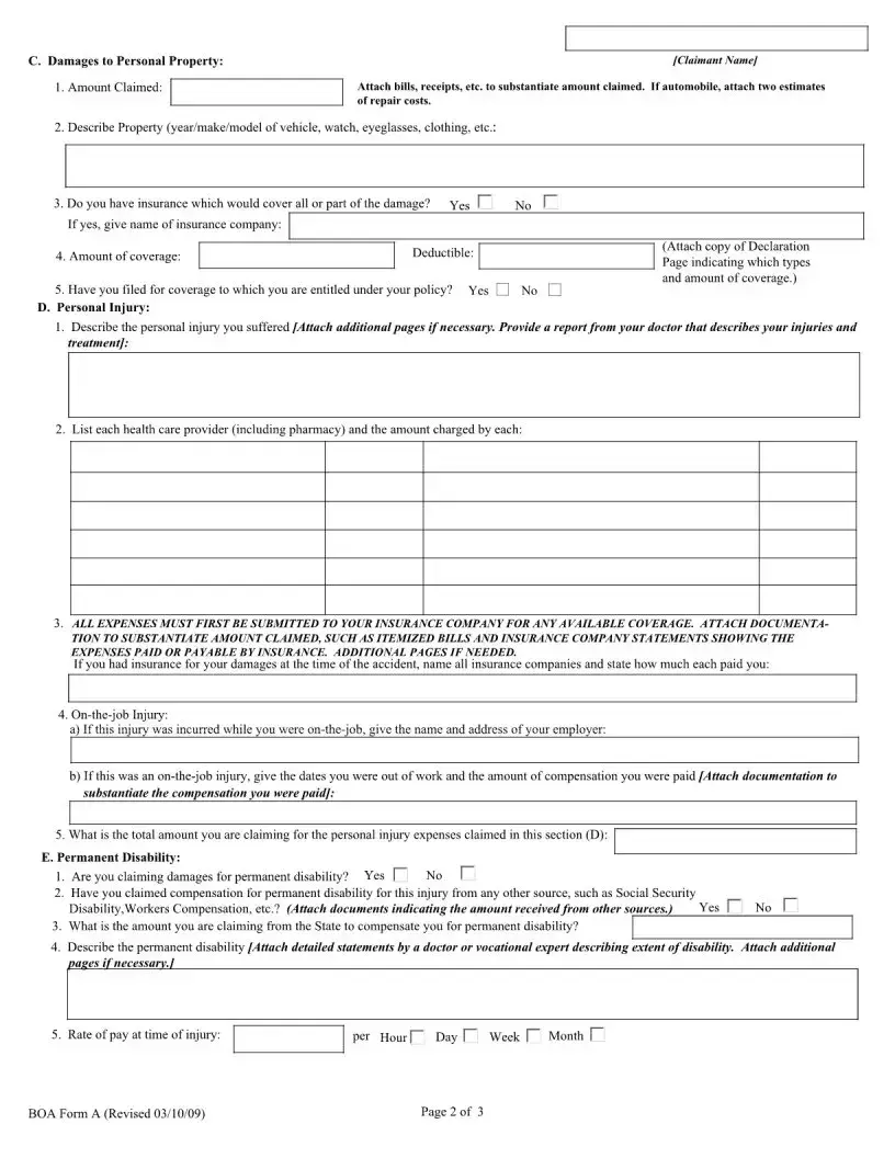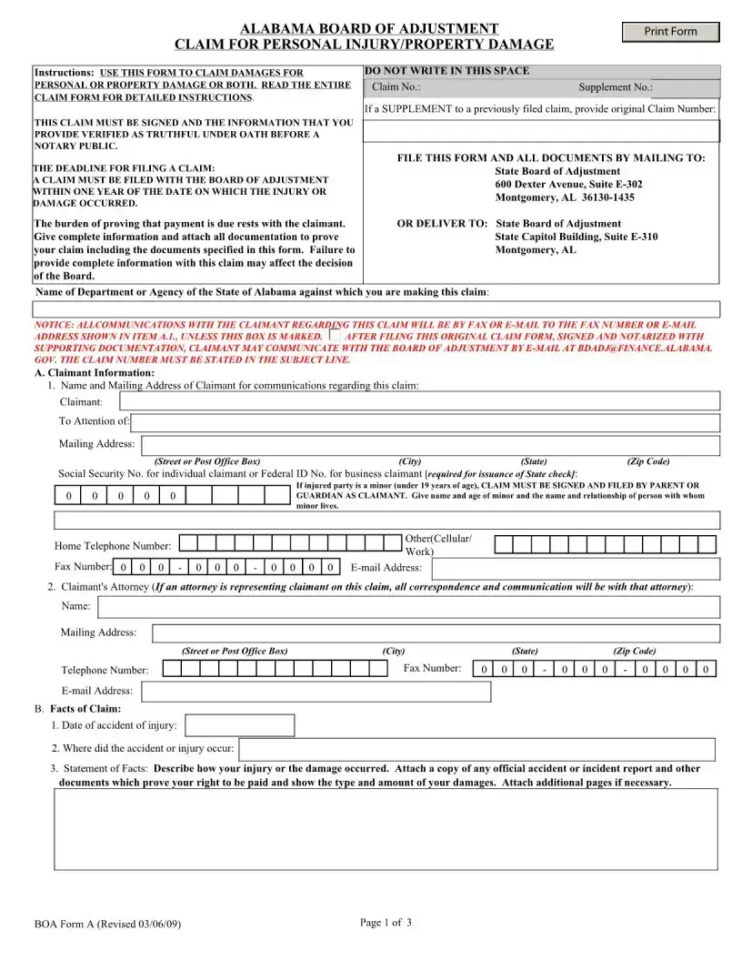 The Alabama Boa A form is used to claim damages for personal injury or property damage. If you’ve suffered due to an accident or incident involving a state agency, this form allows you to formally request compensation for your losses.