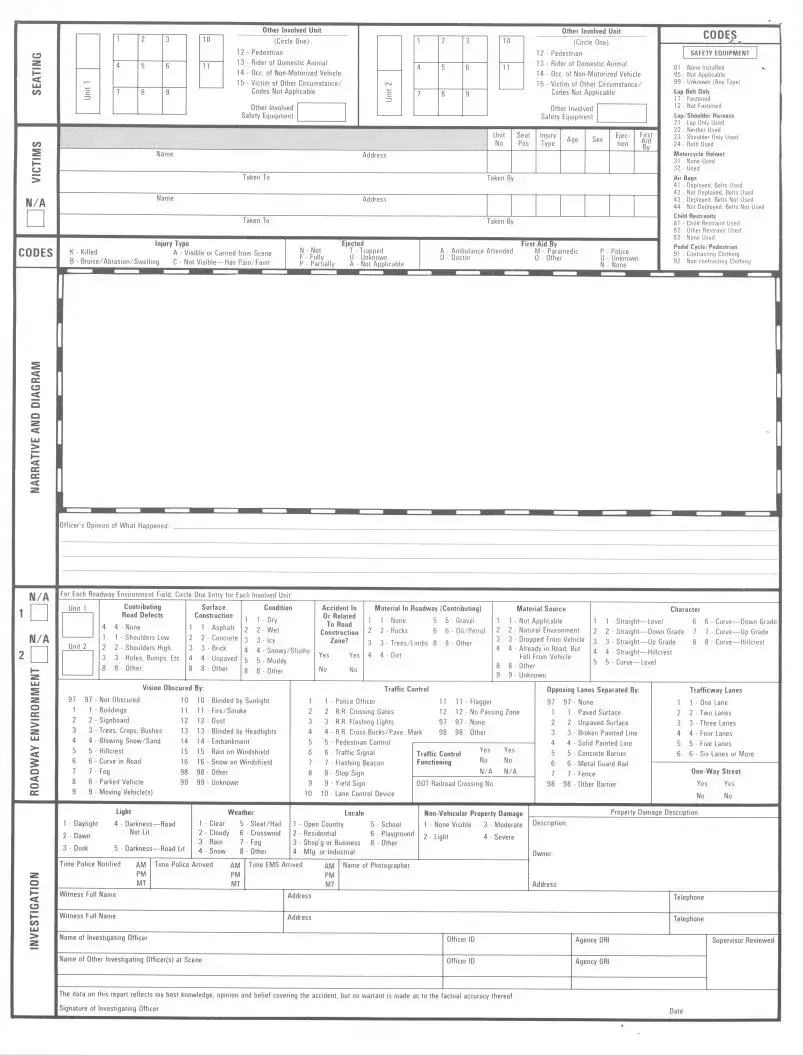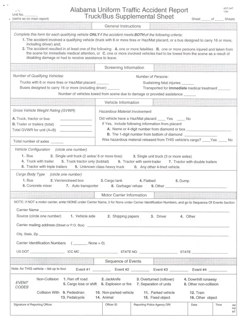 The Alabama Uniform Traffic Report (AST-27) serves as a crucial tool for documenting traffic accidents throughout the state. This form captures essential details such as the date, time, and location of the incident, along with information about the vehicles involved and the individuals affected. It includes sections for identifying the type of collision, whether it was a non-collision event, and the specific conditions at the time of the accident. The report also records contributing factors, such as driver behavior and vehicle defects, which can play a significant role in understanding the circumstances surrounding the accident. Additionally, it collects data on injuries and fatalities, ensuring a comprehensive overview of the event. Witness information, police notifications, and the actions taken by emergency services are also noted. By standardizing this information, the Alabama Uniform Traffic Report facilitates better analysis and response to traffic incidents, ultimately aiming to improve road safety across the state.