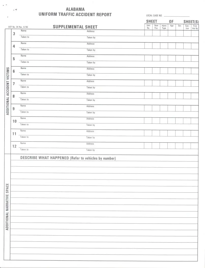 The Alabama Uniform Traffic Report form is a standardized document used by law enforcement to record details of traffic accidents in the state. This form ensures that all necessary information is captured efficiently, aiding in the investigation and analysis of traffic incidents. If you need to fill out this important report, please click the button below.