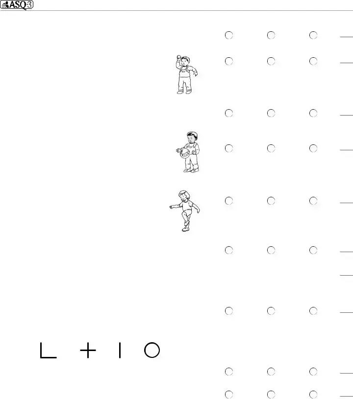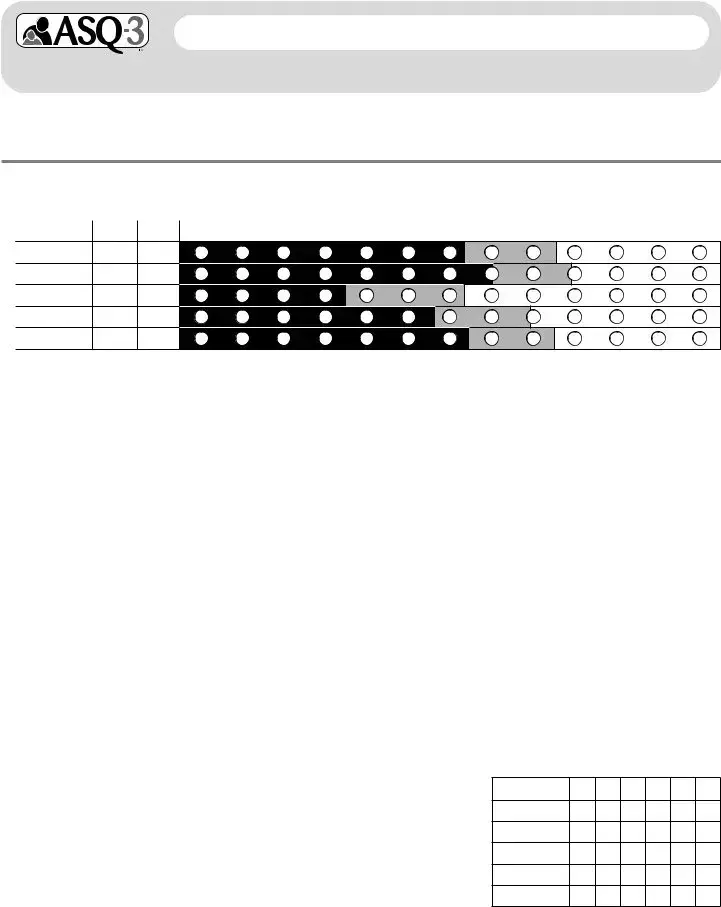 1.SCORE AND TRANSFER TOTALS TO CHART BELOW: See ASQ-3 User’s Guide for details, including how to adjust scores if item responses are missing. Score each item (YES = 10, SOMETIMES = 5, NOT YET = 0). Add item scores, and record each area total. In the chart below, transfer the total scores, and fill in the circles corresponding with the total scores.
