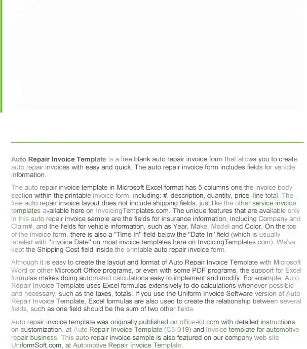 Auto Repair Invoice Template Features and Facts