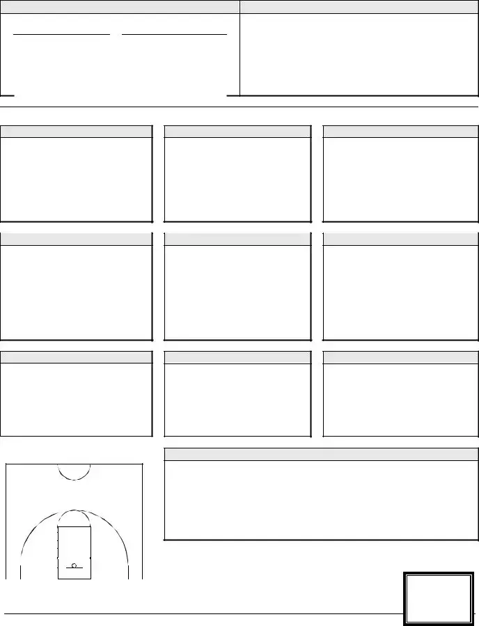 The Basketball Evaluation form serves as a comprehensive tool designed to assess a player's skills and overall performance on the court. Evaluators begin by collecting essential player information, including the athlete's name, date of birth, grade, height, and weight. The form features a rating system that ranges from 1 to 5, where 1 indicates a need for improvement and 5 signifies outstanding performance. Each category—ranging from shooting and defense to dribbling and passing—includes specific skills for evaluation. For instance, shooting encompasses lay-ups, mechanics, and various shooting ranges, while defense assesses position, stance, and help defense. Athletic ability is also evaluated, focusing on speed, quickness, and coordination. Additionally, evaluators consider game play aspects like court sense and team play, as well as the player's coachability, which includes attitude and work ethic. At the end of the evaluation, there is space for overall strengths and additional comments or recommendations, helping to provide a well-rounded picture of the player’s capabilities and areas for improvement.