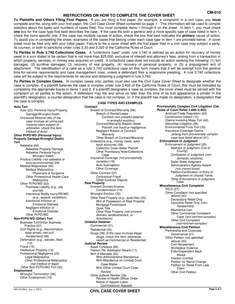 The California Civil Case Cover Sheet, known as form CM-010, plays a crucial role in the civil litigation process. This form is required to be filed with the first paper submitted in a civil case, ensuring that essential information is collected to facilitate case management and statistical analysis. The form includes various sections where parties must provide details such as their contact information, the case name, and the specific type of case being filed, which can range from personal injury claims to complex civil litigation. Additionally, the cover sheet requires the filer to indicate whether the case is classified as complex, which may involve multiple parties or significant legal issues that require special judicial attention. The remedies sought, the number of causes of action, and whether the case is a class action are also important components that must be addressed. By completing this form accurately, parties help the court streamline its processes and ensure that cases are managed effectively from the outset.