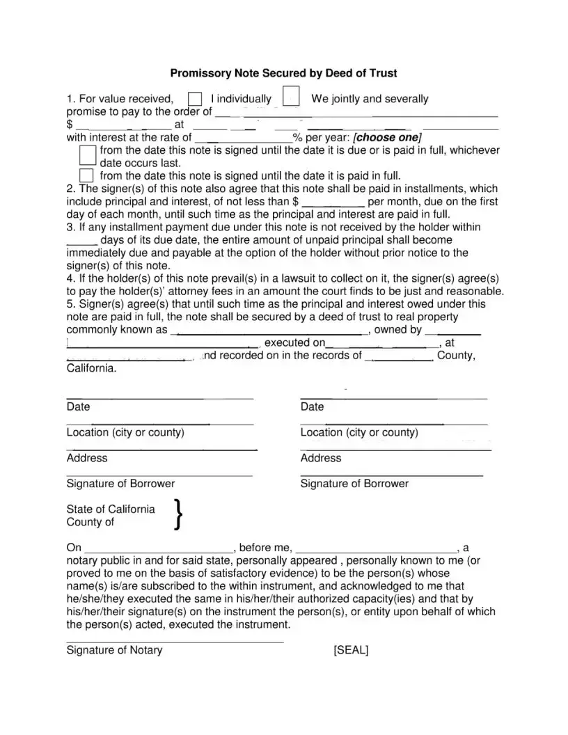 Filling out the California Note Secured form requires careful attention to detail. Each section of the form must be completed accurately to ensure that all parties understand their obligations. After completing the form, it will be necessary to have it notarized to confirm the identities of the signers.