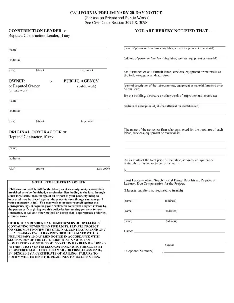 The California Preliminary 20-Day Notice form plays a crucial role in the construction industry, serving as a protective measure for those providing labor, services, equipment, or materials on construction projects. This form is particularly important in both private and public works, as it ensures that all parties involved are informed about the potential for a mechanics' lien. When a contractor or subcontractor has not been paid, this notice acts as a formal alert to property owners, indicating that failure to settle bills may result in a lien against their property. The form requires specific information, including the names and addresses of the construction lender, owner, and original contractor, as well as a description of the work being performed. Property owners must also be aware of their obligations under California law, including the requirement to notify original contractors and lien claimants when a notice of completion or cessation has been recorded. This notice must be sent within ten days and can be delivered via registered, certified, or first-class mail. By understanding and utilizing the Preliminary 20-Day Notice, all parties can better navigate the complexities of construction financing and protect their rights.