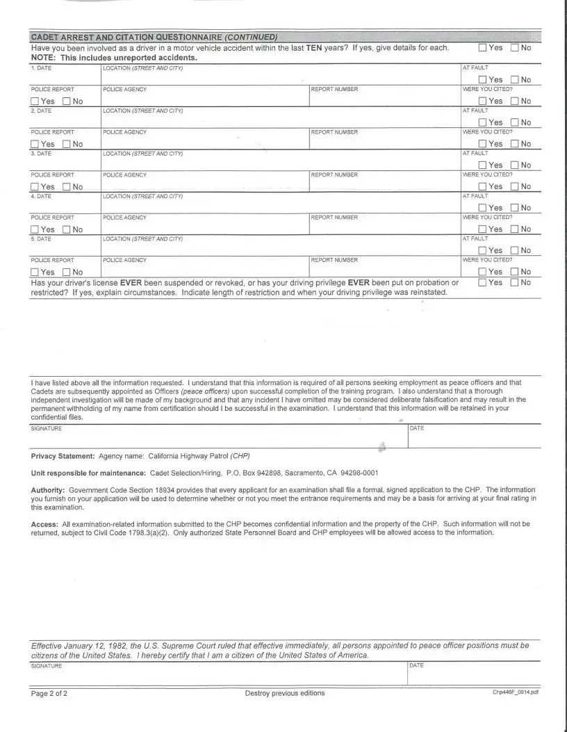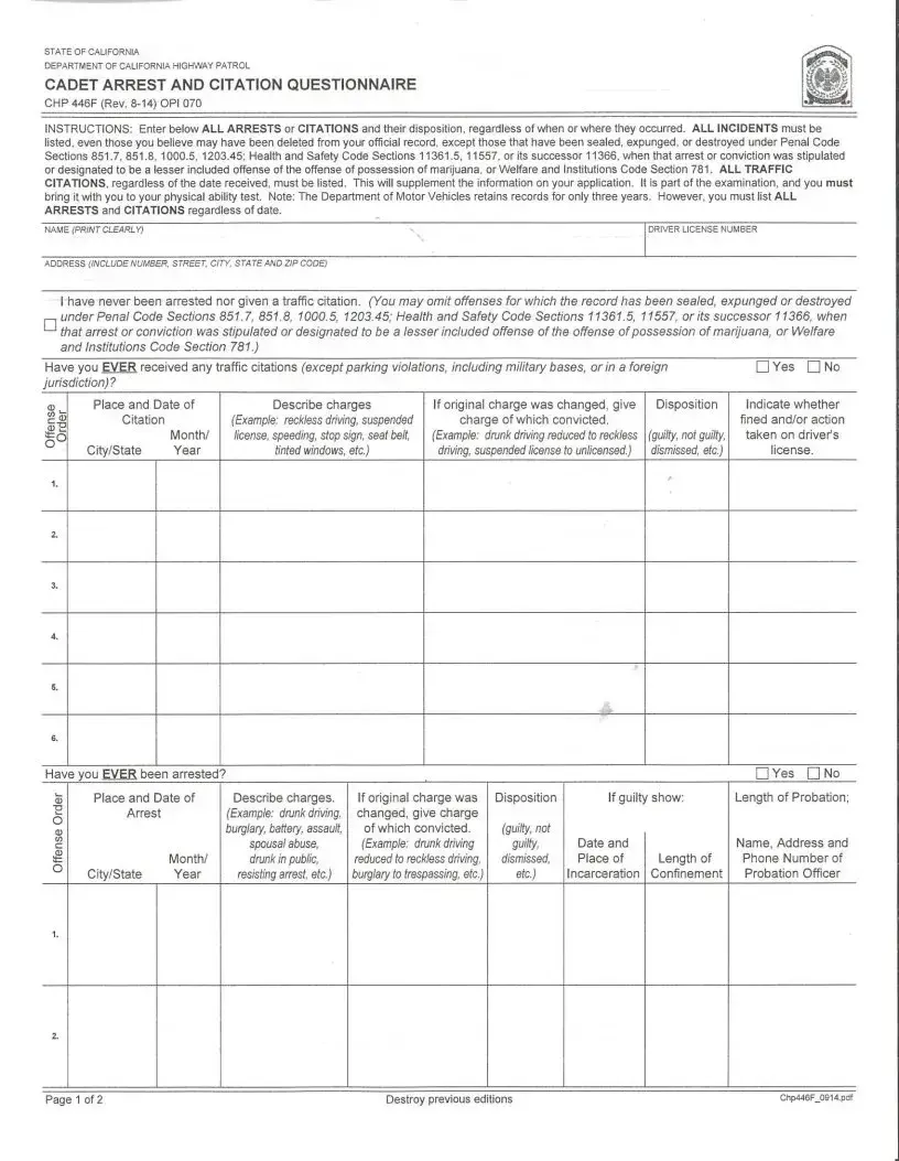 Filling out the CHP 446F form is a crucial step in your application process. It requires you to provide detailed information about any arrests or citations you may have received. Be thorough and honest, as any omissions could affect your application. Once completed, you will need to bring this form with you to your physical ability test.