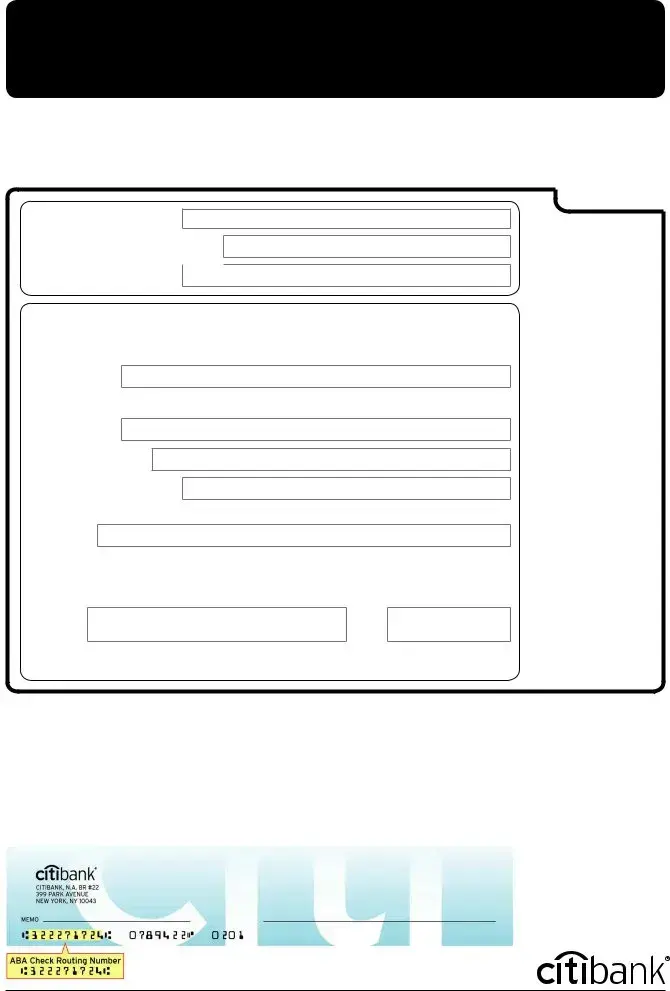 Use this form to request a direct deposit of regular payments from your employer, a pension or retirement payment, Social Security, or from just about anywhere else, into your Citibank® account. With Direct Deposit, you won’t ever have to worry about lost or stolen checks and, as soon as a check is deposited into your Citibank account, it’s avail- able to you as cash.*