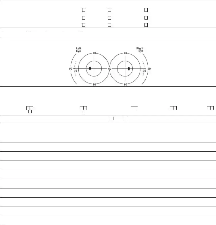 5.VISUAL FIELDS — If vision is not correctable to 20/40 in each eye, or there is possible visual ield loss, a full visual ield examination (con- frontation is permissible) must be performed. Show the approximate peripheral extent and any scotomas in the diagram below.