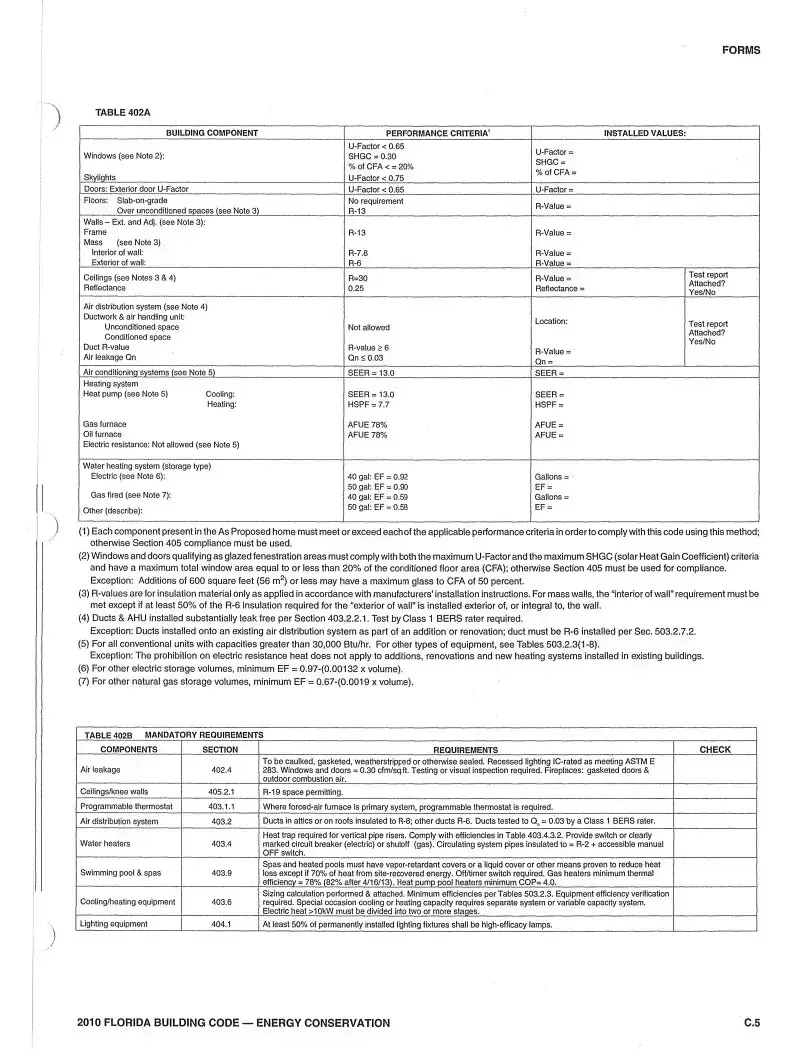 Scope: Compliance with Section 402 of the Florida Building Code, Energy Conservation, shall be demonstrated by the use of Form 402 for single- and multiple-family residences of three stones or less in height, additions to existing residential buildings, renovations to existing residential buildings, new heatingbcoolingJ and water heating systems in existing buildings, as applicable.To comply, a building must meet or exceed all of the energy efficiency requirements on Table 402A and all applica le manoatory requirements summarized in Table 402B of this form. If a building does not comply with this method or Alternate Form 402, it may still comply under Section 405 of the Florida Building Code, Energy Conservation.
