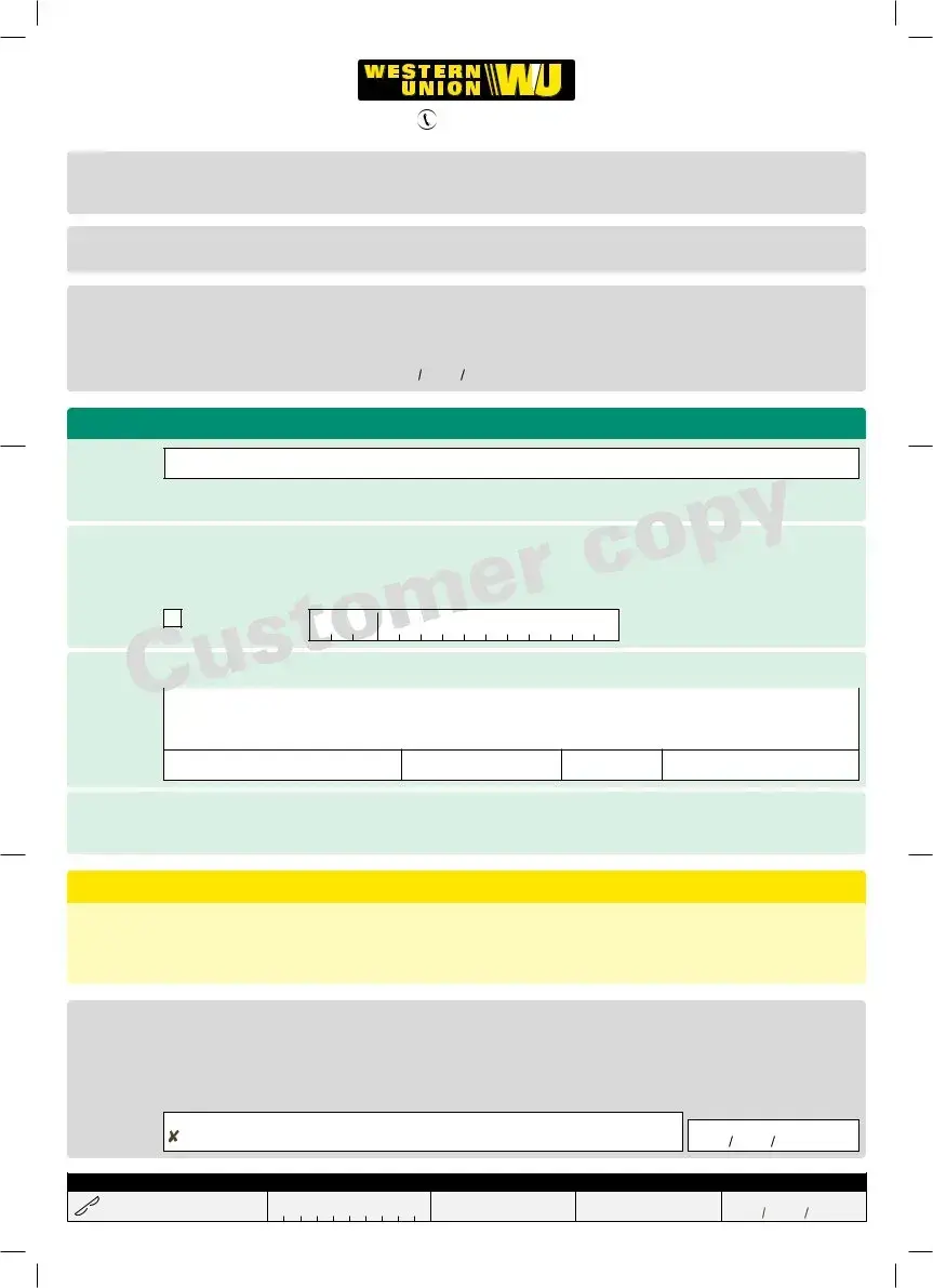 By signing this form, you: 1. Expressly consent to the transfer of your personal data entered above to WU Affiliates located ou tside of the European Economic Area, including to the U.S. for the purpose of providing the money transfer service to you and undertaking the additional data processing activities specified in the Data Protection section of the terms and conditions. You have the right to withdraw your consent at any time. 2. Expressly consent to the carrying out of profiling activities and marketing communications. 3. Confirm that the information you have provided is correct and that you have read and accepted the terms and conditions of the service overleaf.